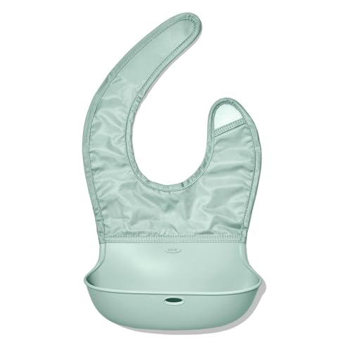 Make mealtime messes more manageable with the OXO Tot Roll-Up Bib. The wide, food-safe silicone pocket catches every stray bite, while the upper fabric portion is soft and splash-resistant. The easy-to-adjust closure grows with your tot and resists tugging – so baby’s clothes stay cleaner, longer. The length is just right so that it won’t interfere with the table or highchair. The Bib rolls up for stashing in strollers and diaper bags, for mealtime, anytime. All done? Wipe down the Bib or toss it in the washing machine.