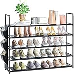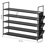 Large capacity long shoe rack: This 5 tier shoe rack black with a side bag offers lots of storage room, 33.3″ wide x 11.2″ deep x 35.6″ tall,can hold 20-25pairs of shoes. An satisfying entryway shoe storage organizer for storing four- five pairs of shoes on each shelf.