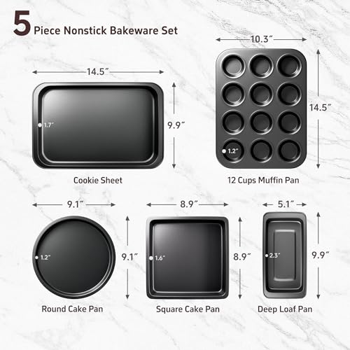 Baking Pans Set, 5-Piece Nonstick Bakeware Set with Round/Square Cake Pan, Loaf Pan, Cookie Sheet and 12 Cups Muffin Pan, Kitchen Cookware Pan Baking Sheet Set for Oven Baking Supplies