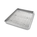 The USA Pan nonstick half sheet pan and bakeable non-stick half sheet cooling rack set includes a 17. 25 x 12. 25 inche half sheet pan and a 16. 75 x 11. 5 half sheet cooling rack. This classic kitchen baking combo is the perfect set for home bakers looking to make freshly baked cookies, cakes, perfect bacon and scones that bake evenly, cool uniformly, and come out tasting great. The USA Pan non-stick half sheet cooling rack fits seamlessly inside the USA Pan non-stick half sheet pan and provides home bakers with an easy way to add the perfect glaze or finish to your homemade baked goods. Simply place your oven safe cooling rack in the pan, add your items on top of the cooling rack, and you are ready to start baking like a professional. The cooling rack is easy to use and features a steel cross wire design and 6 raised feet, which elevate your cookies, breads, cakes, and scones into a raised position. This raised position promotes uniform cooling among your baked items. The nonstick coating on both the half sheet and the cooling rack means that your baked goods will release quickly and easily, leaving your cookie bottoms crispy and intact! Both the half sheet and the cooling rack are oven safe up to 450 degrees Fahrenheit. Handwashing is the preferred method of cleaning the half sheet pan. The cooling rack is not dishwasher safe and it is recommended that you clean the rack using a soft sponge or kitchen brush to remove food particles. USA Pan professional grade bakeware helps everyday home bakers produce professional grade baked goods. USA Pan bakeware is long-lasting, durable, and reliable. USA Pan is a Bundy family owned company, based in the greater Pittsburgh, Pennsylvania area that has been producing high performance bakeware for over 50 years.