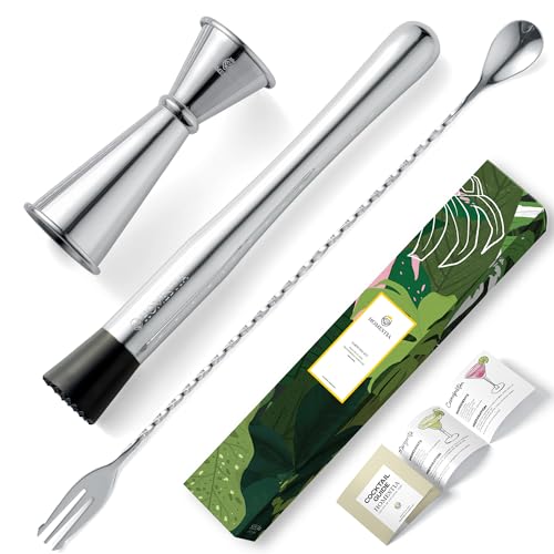 Homestia 10″ Stainless Steel Muddler for Cocktails Drink Muddler, 12″ Cocktail Spoon, 1 oz 2 oz Double Jigger, Basic 3 PCS Cocktail Set Mixing Tools for Drinks, Mini Home Bar Tool Set for Beverages