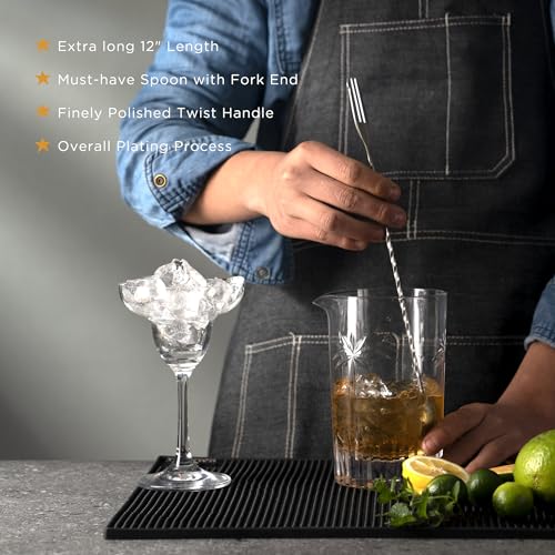 12″ TRIDENT END BAR SPOON: Extra long long stirring spoon, much more easier to reach the bottom of any high glasses/big jars/deep vessels. Larger twisted area on its handle makes liquids easy to swirl and stir. Our forks are more pointed and with a barrier that makes it easier to insert food without slipping.