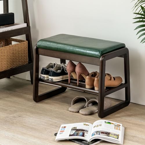 Shoe Bench, Entryway Bench with Leather Cushion, Solid Wood Shoe Rack, Mid Century Modern Bench, Shoe Storage, Shoe Organizer for Entryway, (Dark Green), 21.7 L x 11.8 D x 16.5 H Inches